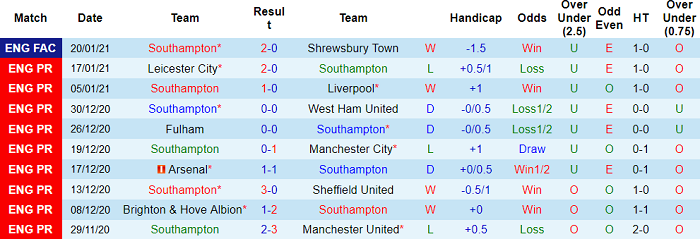 - Thống kê 10 trận gần nhất của Southampton