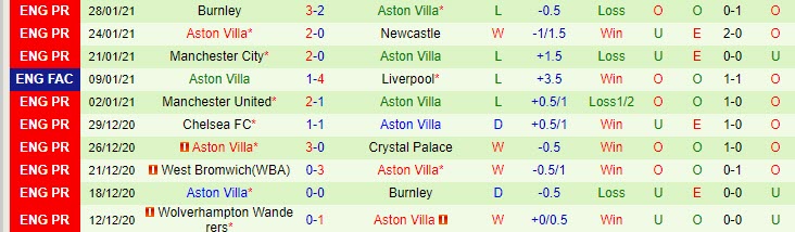 + Thống kê 10 trận gần nhất của Aston Villa