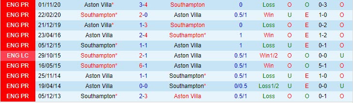 Tính trong 7 trận đối đầu vừa rồi, Aston Villa mới có được 1 trận hòa và còn lại là 6 thất bại khi chạm mặt Southampton tại mọi đấu trường tham dự.