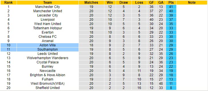 Phong độ và thống kê đối đầu Southampton - Aston Villa gần đây: