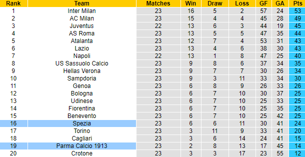 Sau 23 vòng đấu, Parma mới giành được 14 điểm, ghi 17 bàn, thủng lưới 45 lần và hiện đang xếp ở vị trí thứ 2 từ dưới lên trên bảng xếp hạng. 12 trận liên tiếp gần đây tính trên mọi đấu trường, Parma bất thắng với 10 thất bại và 2 trận hoà. Trong khi đó Spezia đang cho thấy dấu hiệu khởi sắc với 2 chiến thắng ở 3 trận gần đây. Trên bảng xếp hạng Serie A, Spezia đang xếp thứ 16 với 24 điểm sau 23 trận.
