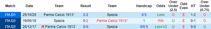 Parma bất bại cả 3 trận đối đầu Spezia trong quá khứ. Lần gần nhất làm khách trên sân của Spezia, Parma giành chiến thắng thuyết phục với tỷ số 2-0. Tuy nhiên ở trận đấu sắp tới, Parma lại không được tin tưởng vào khả năng có điểm chứ chưa nói đến việc giành chiến thắng. Lý do đến từ phong độ yếu kém của Parma ở Serie A mùa này.