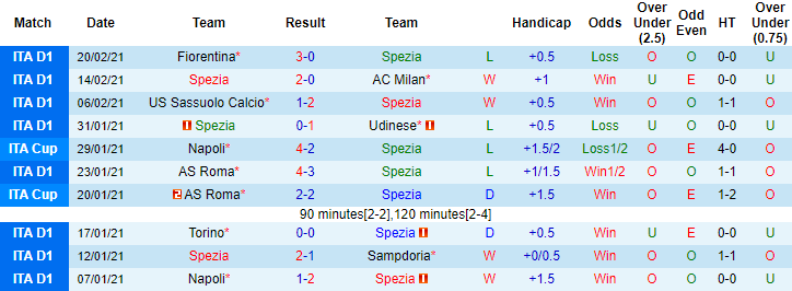 + Thống kê 10 trận gần nhất của Spezia