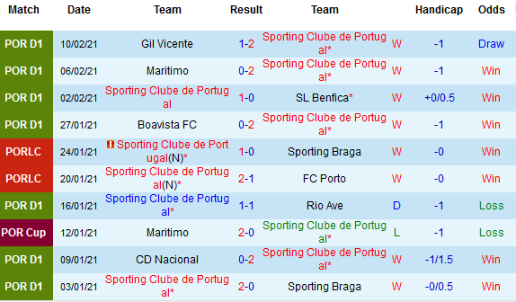 + Thống kê 10 trận gần nhất của Sporting Lisbon