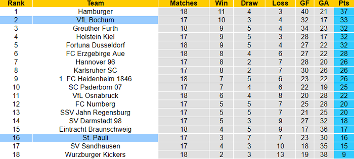 St Pauli rõ ràng đã giành được những kết quả khả quan trong thời gian gần đây. Họ bất bại cả 4 vòng vừa qua và thu về 8/12 điểm tối đa. Thành tích này tích cực hơn hẳn so với việc chỉ có 8 điểm từ 13 vòng trước đó.