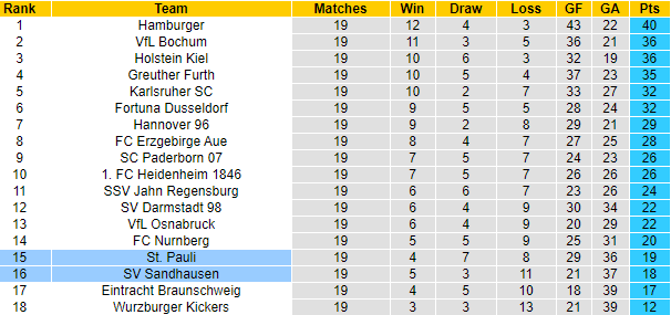 Nếu như St. Pauli đứng thứ 15 với 19 điểm thì Sandhausen xếp ngay sau với 1 điểm ít hơn. Nên nhớ vị trí mà Sandhausen đang sở hữu sẽ phải đá play-off chống xuống hạng. Mà đừng quên rằng đối thủ đứng thứ 17 hiện chỉ kém St. Pauli và Sandhausen lần lượt có 1, 2 điểm.
