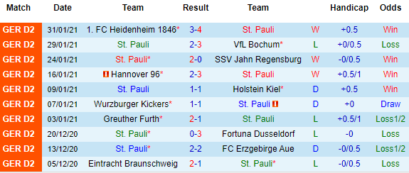 + Thống kê 10 trận gần nhất của St. Pauli