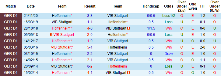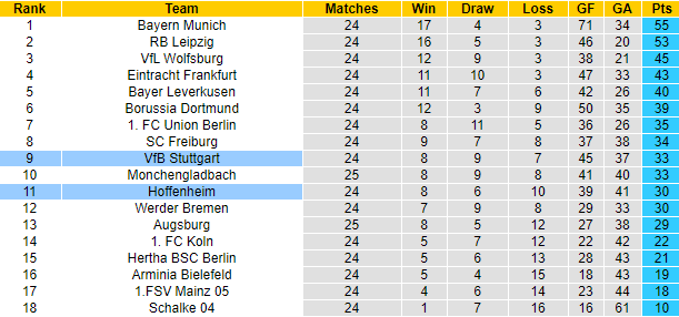 Hoffenheim bất bại cả 3 trận đối đầu Stuttgart gần đây với 1 chiến thắng và 2 trận hòa. Dẫu vậy ở lần tái đấu sắp tới, Hoffenheim sớm bị nghi ngờ vào khả năng có điểm. Lý do là bởi họ đang sa sút phong độ rất rõ bởi đội hình vắng tới 8 cầu thủ vì chấn thương. 8 trận gần đây tính trên mọi đấu trường, Hoffenheim chỉ thắng được 2 trận, còn lại là 3 thất bại và 3 trận hòa.