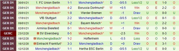 + Thống kê 10 trận gần nhất của M'gladbach