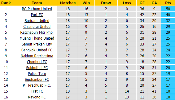 BẢNG XẾP HẠNG GIẢI VĐQG THÁI LAN