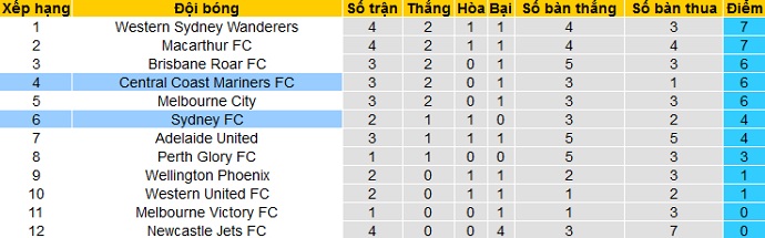 Bảng xếp hạng giải VĐQG Úc vòng 4
