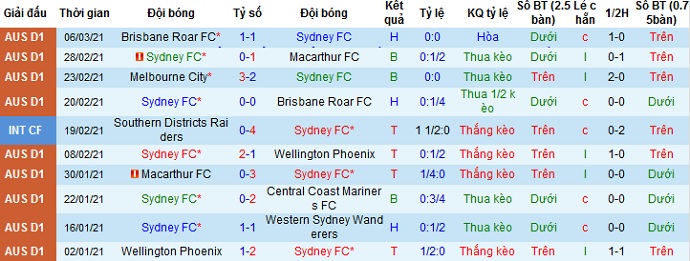 + Thống kê 10 trận gần nhất của Sydney FC