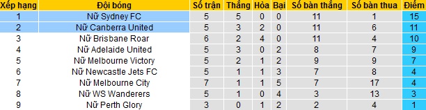 Bảng xếp hạng giải VĐQG nữ Úc vòng 6
