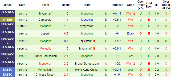 + Thống kê 10 trận gần nhất của Mông Cổ