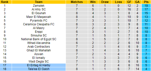 Mùa trước Tala'ea Al Jaish Cairo và Al Intagh Al Harbi có được sự an toàn ở những khu vực giữa BXH nhưng tình cảnh của đôi bên ở mùa này bi đát hơn nhiều. Cuộc chiến trụ hạng với đôi bên bắt đầu ngay từ thời điểm này dù rằng mới trôi qua chưa được 1/4 chặng đường.