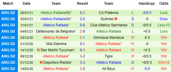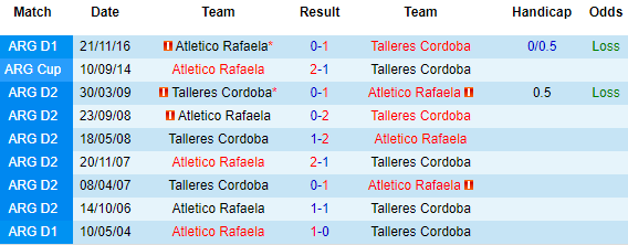 Phía đối diện, Atletico Rafaela cũng đang có phong độ không tốt ở giải hạng 2. Theo đó thì 4 trận mới nhất, Rafaela đều chỉ biết hòa với thua. Đẳng cấp thua kém nhưng trên phương diện đối đầu thì Rafaela lại nhỉnh hơn Talleres Cordoba với 6 chiến thắng và 1 trận hòa ở 9 lần gặp nhau trước đây.