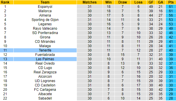 Ở đấu trường mà sự phân cấp không cao như giải Hạng 2 Tây Ban Nha, cách biệt 9 điểm giữa Tenerife với vị trí thứ 6 là rất khó san lấp. Dẫu thế thì cả Tenerife lẫn Las Palmas đều không cần lo lắng, bởi họ đang hơn nhóm cầm đèn đỏ số điểm khá lớn.