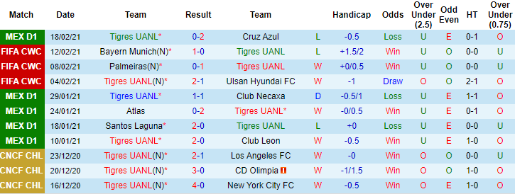 + Thống kê 10 trận gần nhất của Tigres UANL