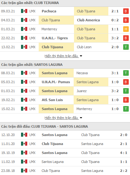 Phong độ và thống kê đối đầu gần đây Tijuana vs Santos Laguna: