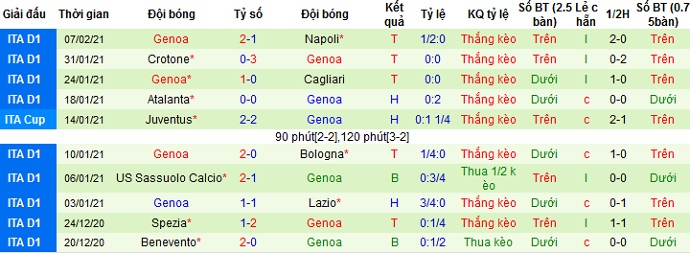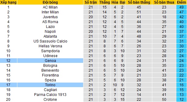 Với Genoa, ở mùa giải trước đội bóng cũng chỉ đứng ngay trên nhóm đèn đỏ ở vị trí thứ 17. Tuy nhiên hiện tại Genoa đang đứng thứ 12 trên bảng xếp hạng với 24 điểm cũng sau 21 vòng đấu, duy trì khoảng cách khá an toàn với nhóm đèn đỏ là 9 điểm.