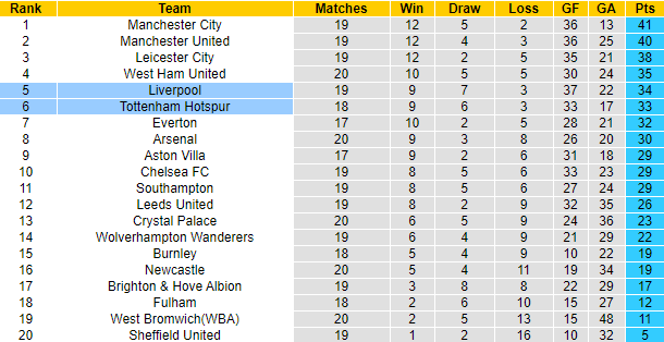 Trên bảng xếp hạng Ngoại hạng Anh, Liverpool đã bị đánh bật khỏi Top 4. Cụ thể, The Kop xếp ở vị trí thứ 5 với 34 điểm sau 19 trận. Trận đấu sắp tới Salah và đồng đội sẽ phải hành quân đến sân của Tottenham - đội bóng đang xếp ở vị trí thứ 6 với 33 điểm nhưng lại đá ít hơn Liverpool 1 trận.