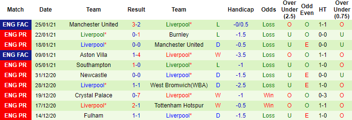 Liverpool đang thực sự khủng hoảng giai đoạn gần đây. 7 trận vừa qua tính trên mọi đấu trường, The Kop không thắng 6 trận với 3 thất bại và 3 trận hòa, toàn thua theo kèo châu Á. Tại Cúp FA, Liverpool vừa bị MU loại ở vòng 4 với thất bại 2-3 dù có bàn mở tỷ số trước.