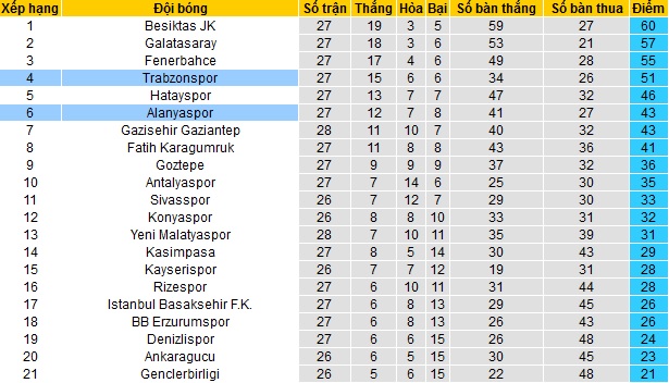 Trong khi đó Alanyaspor đang đứng thứ 6 trên bảng xếp hạng với 43 điểm cũng sau 27 vòng đấu. Mặc dù kém chính đối thủ 8 điểm trong khi giải vẫn đang còn tới 13 vòng đấu nhưng có vẻ như Alanyaspor đã buông xuôi ở mùa giải này.