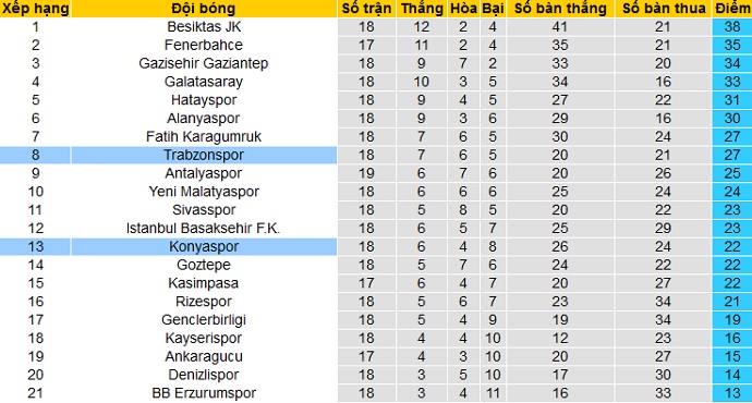 Trong khi đó Konyaspor chỉ đang đứng thứ 13 trên bảng xếp hạng với 22 điểm sau 18 vòng đấu. Tuy nhiên đây không phải là điều bất ngờ khi ở mùa giải trước Konyaspor cũng về đích ở đúng vị trí thứ 13. Hiện tại đội bóng vẫn còn đang hơn nhóm các đội cầm đèn đỏ tới 6 điểm.