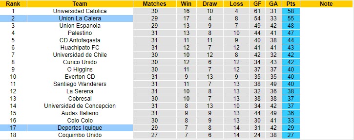 Lúc này, họ tạm thời kém đội đầu bảng Universidad Católica khoảng cách 3 điểm, đồng thời hiệu số bàn thắng thua kém – dương 21 bàn so với dương 30 bàn. Với hoàn cảnh hiện tại, Union La Calera vẫn sẽ đứng ở vị trí thứ 2 nếu giành trọn 3 điểm ở trận đấu đêm nay.