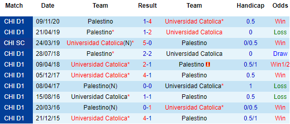 Làm khách trên sân của đội đầu bảng được cho là thử thách lớn với Palestino. Universidad Catolica có thực lực mạnh, lại được chơi trên sân nhà và nhận được sự ủng hộ từ lịch sử. Trong 6 lần gặp gỡ gần đây giữa đôi bên, Universidad Catolica thắng tới 5 và hòa 1.