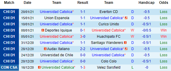 + Thống kê 10 trận gần nhất của Universidad Catolica
