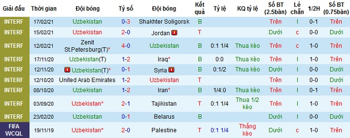 + Thống kê 10 trận gần nhất của Uzbekistan