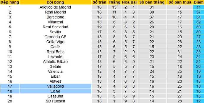 Là tân binh của giải đấu khi mới được thăng hạng từ mùa này, Elche đang có nguy cơ quay trở lại hạng dưới khi đứng ngay dưới đối thủ ở vị trí thứ 18, một trong ba vị trí phải xuống hạng. Tuy mới có được 16 điểm nhưng Elche cũng mới chỉ thi đấu 16 trận, kém so với hầu hết các đội khác từ 1 đến 2 trận đã đấu.
