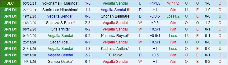 + Thống kê 10 trận gần nhất của Vegalta Sendai