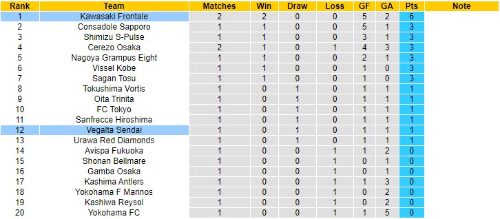 Phong độ và thống kê đối đầu Vegalta Sendai - Kawasaki Frontale gần đây:
