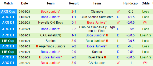 + Thống kê 10 trận gần nhất của Boca Juniors