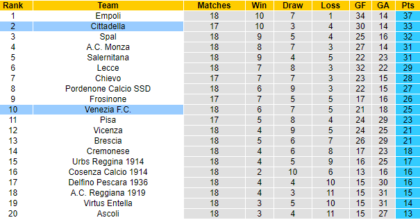 Gần nửa chặng đường đã trôi qua và cả Venezia lẫn Cittadella đều sáng cửa với những mục tiêu mình đề ra. Với Cittadella, khả năng thăng hạng trực tiếp hoàn toàn rộng mở khi họ đang có vị trí thứ 2 trên BXH và lại chơi ít hơn những đối thủ xung quanh 1 trận.