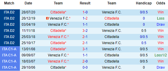 + Lịch sử đối đầu Venezia vs Cittadella