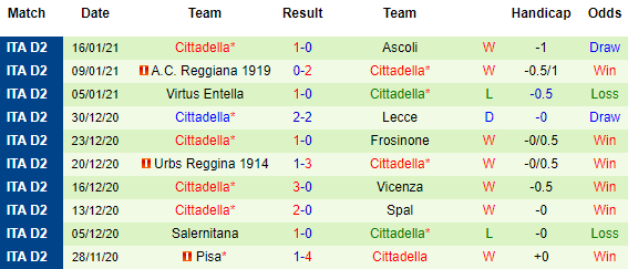 + Thống kê 10 trận gần nhất của Cittadella