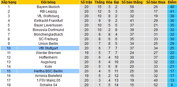 Trái lại Hertha Berlin thi đấu có phần sa sút trong mùa giải này. Hiện tại đội bóng đã rơi xuống vị trí thứ 15, sát với nhóm đèn đỏ. Với 17 điểm có được sau 20 vòng đấu, Hertha Berlin cũng chỉ có bằng điểm với đội đứng ngay sau Arminia Bielefeld và còn đang thi đấu nhiều hơn 1 trận.