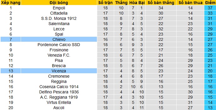 Bảng xếp hạng Serie B trước vòng 18