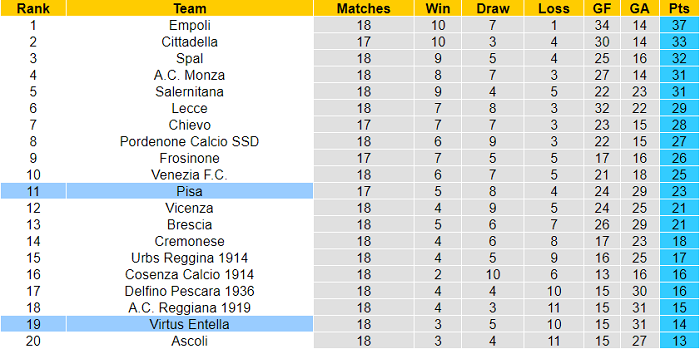 Trước màn so tài với Virtus Entella, Pisa trải qua chuỗi 8 trận bất bại tại Serie B. Họ hòa một nửa trong chuỗi bất bại này: hòa 4, thua 4.