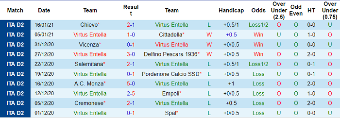 - Thống kê 10 trận gần nhất của Virtus Entella