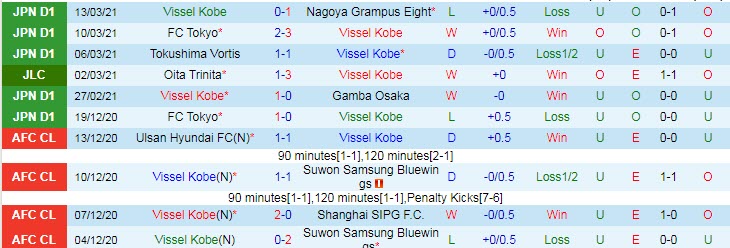 + Thống kê 10 trận gần nhất của Vissel Kobe