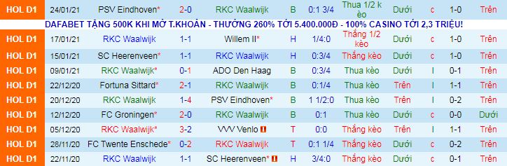 Khả năng tận dụng sân nhà của RKC Waalwijk cũng đang có chiều hướng đi xuống với chỉ 1 chiến thắng có được ở 12 trận đấu được chơi tại đây trước đó. Trong khi đó, Fortuna Sittard đang thi đấu ấn tượng trên sân khách khi giành 3 chiến thắng và 1 thua ở 4 lần làm khách gần nhất.