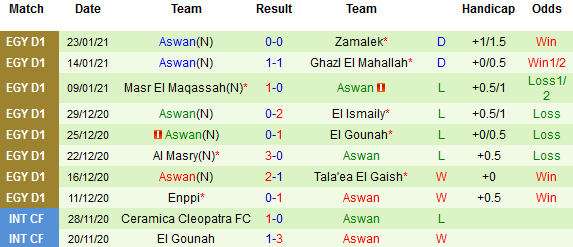 Trong khi đó, Aswan đang phát đi tín hiệu tích cực với 2 vòng gần nhất đều bất bại dù gặp các đối thủ mạnh như Al Zamalek hay Ghazl El Mahallah. Trên sân khách Aswan cũng vừa có 2 trong 3 trận gần nhất giành chiến thắng.