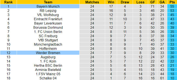 Werder Bremen mùa trước còn phải thi đấu vòng Play-off để được tham dự Bundesliga mùa này. Vì vậy, việc họ thu về 30 điểm sau 24 vòng của Bundesliga 2020/21 là sự tiến bộ đáng ghi nhận.