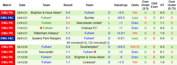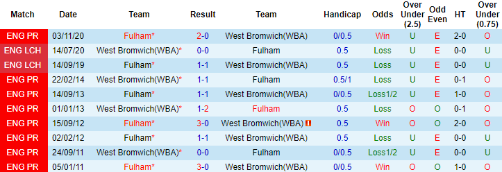 10 lần chạm trán West Brom gần đây, Fulham bất bại với 4 chiến thắng và 6 trận hoà. Lượt đi giải Ngoại hạng Anh mùa này, Fulham khiến West Brom nhận thất bại tâm phục khẩu phục với tỷ số 0-2. Trên sân nhà, 5 trận vừa qua West Brom toàn thua, thủng lưới 22 lần và chỉ ghi được 1 bàn danh dự.