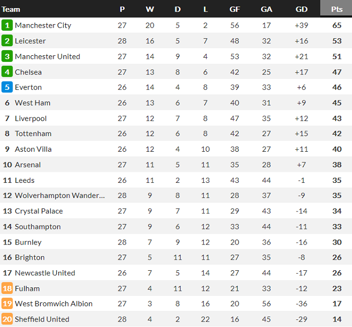 Bảng xếp hạng Ngoại hạng Anh mới nhất