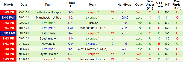 - Thống kê 10 trận gần nhất của Liverpool
